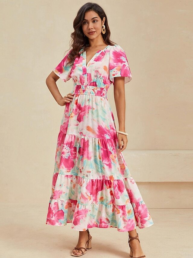 Women's Tiered Dress Tie Dye Elastic Waist V Neck Maxi Dress Stylish Vacation Short Sleeve Summer