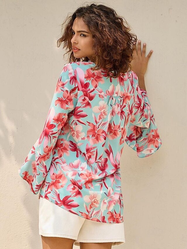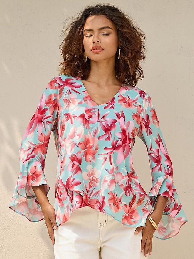 Women's Blouse Chiffon Floral Asymmetric Vacation Stylish Bell Sleeve 3/4 Length Sleeve V Neck Light Green Spring & Fall